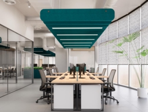 El mobiliario, de tonalidades claras y acabado en madera, se integra a un entorno predominantemente blanco, generando un ambiente equilibrado y acogedor. En las zonas abiertas, se incorporaron paneles fonoabsorbentes modulares y colgantes de diseño ligero, que aportan sofisticación visual y mejoran el confort acústico.