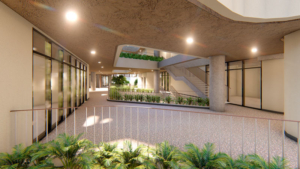 El corazón de la plaza está conformado por un amplio atrio central que combina vegetación, jardines y mobiliario contemporáneo, creando un entorno acogedor y relajante que promueve la permanencia y la interacción social. Los recorridos abiertos y accesibles, libres de circulación vehicular,