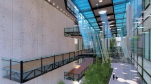 El proyecto destaca por sus acabados de alta calidad: las fachadas combinan muros cortina de vidrio con louvers metálicos en las zonas expuestas a la radiación solar, proporcionando control térmico pasivo y una imagen moderna y elegante; los pisos se presentan en porcelanato de alto tráfico, granito natural y mármol en áreas representativas; y los muros interiores y exteriores cuentan con recubrimiento acrílico de alta calidad con textura y color que simulan granito cortado o pulido, logrando un acabado duradero, elegante y de bajo mantenimiento.